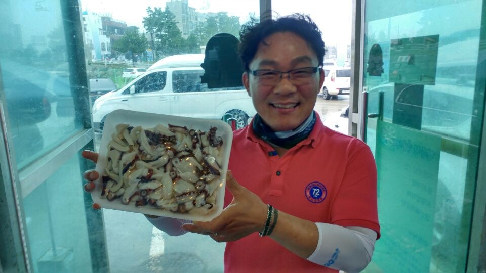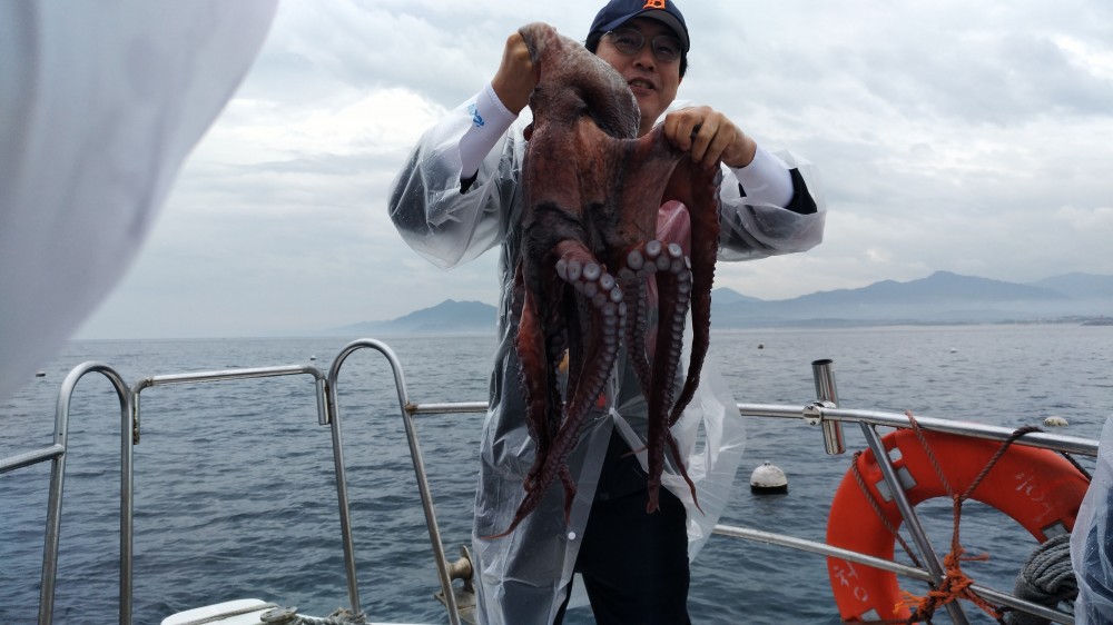 비가 오는 날인데 강릉피싱호 손님들의 열정에 대왕문어가 나옵니다 이렇게 비가오는 날에 고기가 더많이 나오는 경우가 많이 있습니다 역시 용왕님도 노력하는 사람에겐 선물을 주나봅니다
